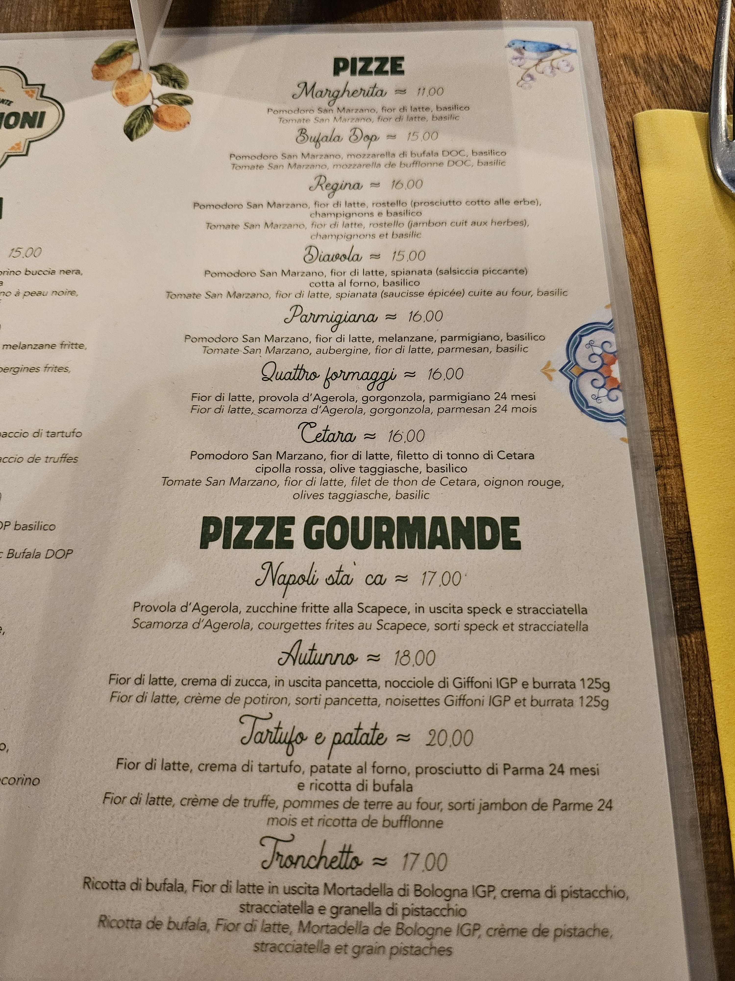 Personnellement je trouve qu'à vouloir en faire trop ça fini par être ridicule.... Je parle du menu tout écrit en italien. Ok.... Vous êtes italien... Accent etc........ Mais moi je veux pouvoir lire le menu bon sang ! Donc menu en français et anglais serait pratique svp ! Sinon Les pizzas sont bonnes (15€ en moyenne), et deux formules (18€ et 22€ je crois) dont proposées avec boissons et dessert.